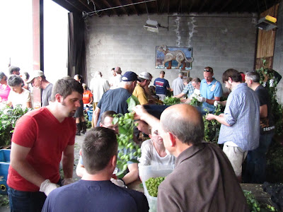 Most of the tables of the large patio were piled high with hops from all over town, given by friends of the pub. The patio filled quickly with eager pickers. The hairy vines cause itchy arms, so most folks wear gloves or long sleeves.